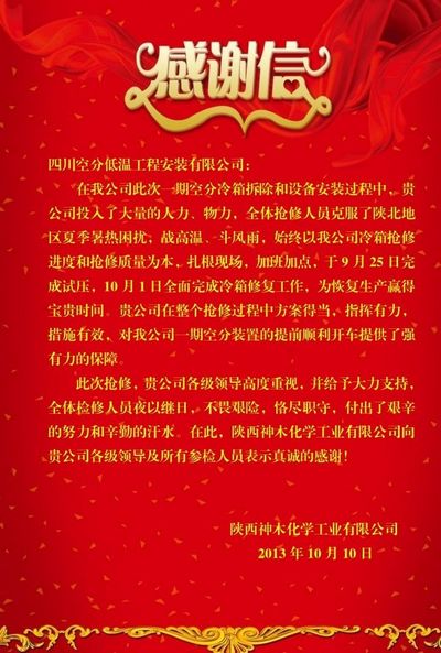 此次抢修,贵公司各级向导高度重视,并给予鼎力大举支持,全体磨练职员夜以继日,不畏艰险,恪尽职守,支付了艰辛的起劲和辛勤的汗水。在此,陕西神木化学工业有限公司向贵公司各级向导及所有参检职员体现真诚的谢谢!